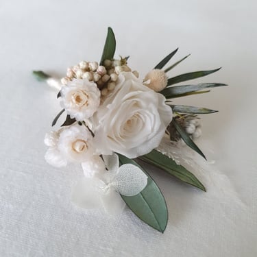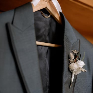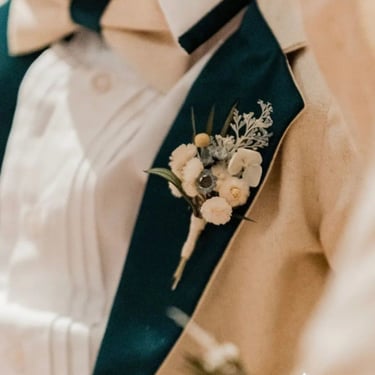 É importante considerar o design do fato do noivo na escolha dos pormenores do boutonniere, para que tudo se conjugue e não fique "too much". Poderá adquirir um boutonniere by Verónica Teixeira desde 17€/un.
