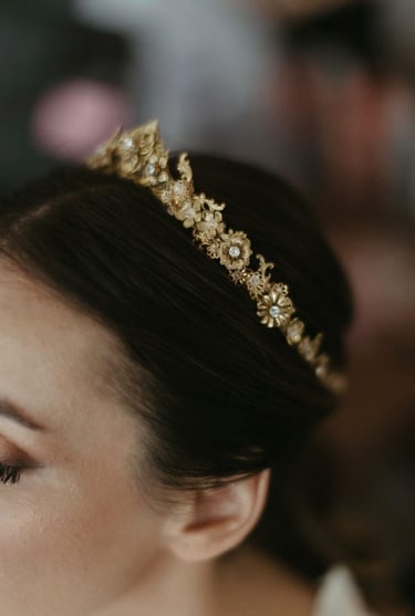 A Carina chegou-nos com uma ideia muito especial. Adorava tiaras, mas não queria que fosse uma peça alta. Era também importante que os elementos a incluir fossem flores e folhas pequenas e delicadas, de forma a conjugar bem com a renda da sua capa. Um outro detalhe importante era a combinação com os seus brincos. Para o efeito, acrescentamos também zircônias em alguns pontos, para fazermos essa ligação. Para a altura da festa, a Carina queria trocar a tiara por uma gargantilha, então criamos uma peça cujo centro tinha um design idêntico ao centro da tiara. Foi dessa forma que foi feita a passagem para um momento diferente mas mantendo o mesmo registo dos restantes acessórios.