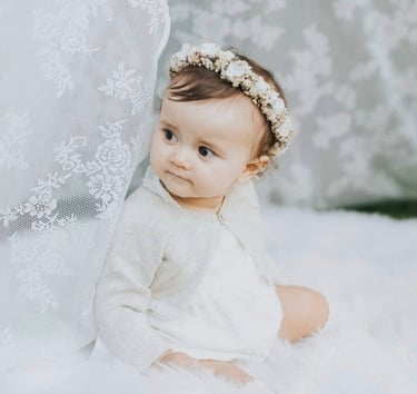 Os nossos toucados para criança são criados com suavidade e encanto, pensados para acompanhar os mais pequenos com conforto, delicadeza e um toque de magia.