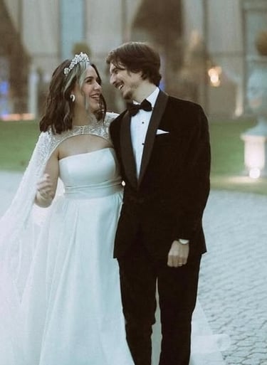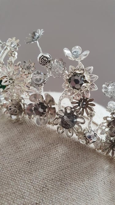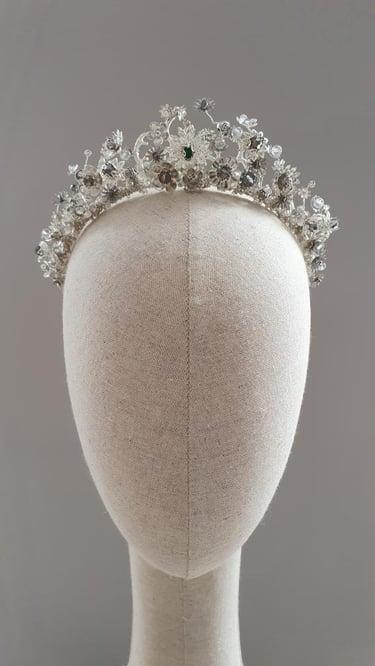 A inspiração da Daniela é verdadeiramente única e especial porque todo o casamento foi repleto de detalhes que fizessem lembrar a magia de uma história de fantasia. A começar pela época do ano: inverno, perto do natal. Todo o seu look foi pensado para se transformar numa rainha do gelo, então o design da tiara teria de transmitir essa ideia. Havia também dois detalhes em particular que a Daniela pediu para serem colocados de forma discreta na peça, algo que apenas ela e o noivo deveriam perceber. Um cristal verde muito discreto (alusão à pedra do anel de noivado) e pequenas rosas espalhadas pela tiara (ligação com o conto "A Bela e o Monstro").
