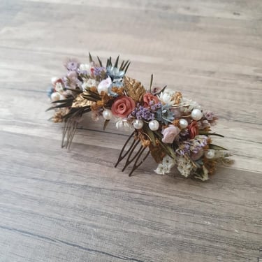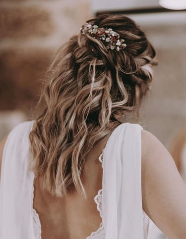 A Francisca chegou-nos com um pedido muito particular, dentro da linguagem dos toucados botânicos. Queria que fosse usada a paleta de tons do convite, conjugando com algumas pérolas (para fazer a ligação com os brincos), incluindo também um toque de dourado. O problema é que ela não gostava dos elementos metálicos que normalmente são usados, queria manter a linguagem natural na sua totalidade. Então optamos por produzir folhas douradas em porcelana fria, dando um acabamento talha dourada, usando folha de ouro para o efeito.