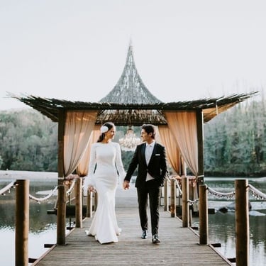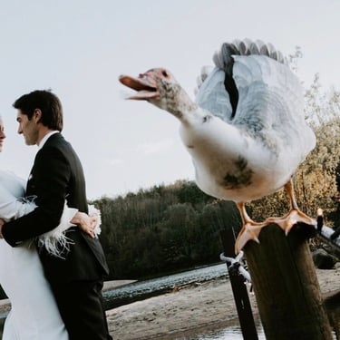 A Inês foi uma noiva de inverno. Esta época é muito inspiradora e permite a criação de alguns moodboards "fora da caixa". Conjugar mangas de plumas com um vestido minimalista, foi uma escolha muito inteligente. Mas a Inês queria um toucado com personalidade para fazer o match perfeito, e usar os materiais convencionais para o efeito, simplesmente não encaixava. Desenhamos então uma peça também usando plumas. Aqui ela foi usada atrás sobre o rabo de cavalo, mas também poderia ser usada por baixo de um coque (se ela usasse cabelo preso), ou então à frente como bandolete. E porque adoramos conjugações inusitadas...até o pato quis fazer parte do "quadro" final!