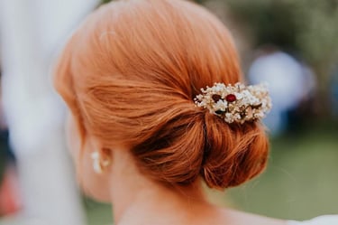 A Lúcia tinha uma característica muito interessante: todas as escolhas que fez para o seu dia foram de uma simplicidade incrível, na onda do "menos é mais". Mas depois adicionava pequenos detalhes que tornavam o simples, impactante. E o toucado seguiu esse mesmo registo. Era constituído apenas por flores secas, numa paleta exclusivamente beje, de vários tons diferentes. O detalhe que criou a diferença aqui, foi a inclusão de várias flores de tom bourdeaux com um toque acetinado, criando assim a ligação perfeita com os sapatos do mesmo tom. Criamos também o seu bouquet de flores preservadas, ramo para solteiras e coroa infantil. Foi também com um gosto enorme que demos a nossa contribuição com um detalhe dentro do mesmo registo, na decoração do bolo de noivos.