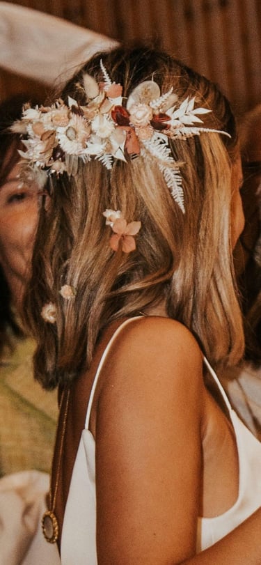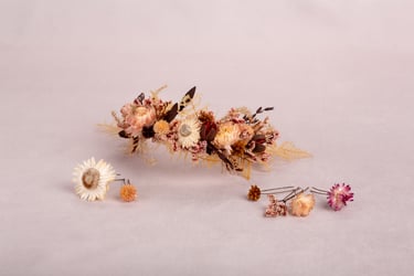 A Maria chegou-nos com um pedido muito específico. Um toucado de flores secas com tons outonais, bastante volumoso e com algumas flores soltas por entre os cabelos, como se tivessem caído. Testamos várias formas para conseguir este resultado, e o método que se revelou mais eficaz foi a utilização de pequenos arames, preparados previamente para o efeito.