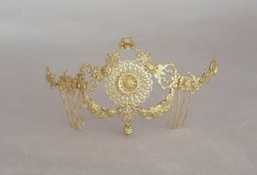 O design do toucado da Sofia foi uma criação a "quatro mãos", com uma distância de 300km a separar-nos (parecia que estávamos lado a lado tal era a conexão). A grande magia desta peça é o facto de ser acima de tudo conceptual, uma homenagem à sua ancestralidade espanhola. Podemos portanto, identificar facilmente traços muito similares às tradicionais peinetas espanholas, embora aqui o intuito não era que a peça ultrapassasse acima do nível da cabeça, como acontece na inspiração original.